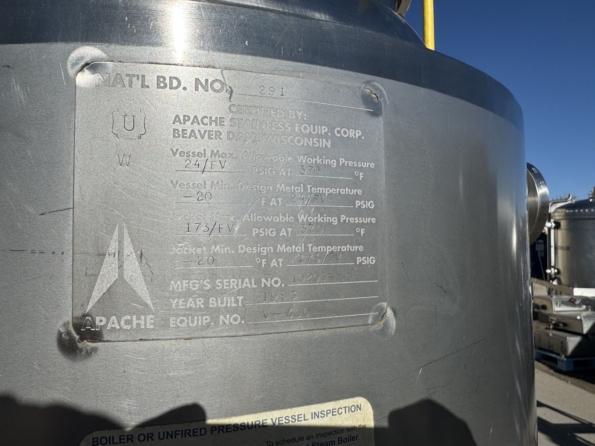 65 GALLON PROCESSOR TANK. MANUFACTURER APACHE SERIAL 10201-1. , CYLINDRICAL, DOMED TOP , DISH BOTTOM , JACKET, 304 SS EXTERIOR, 1 1/2" TC OUTLET. HIGH SHEAR LIGHNIN' MIXER. THERMOWELL. HEIGHT 101", DIAMETER 34".