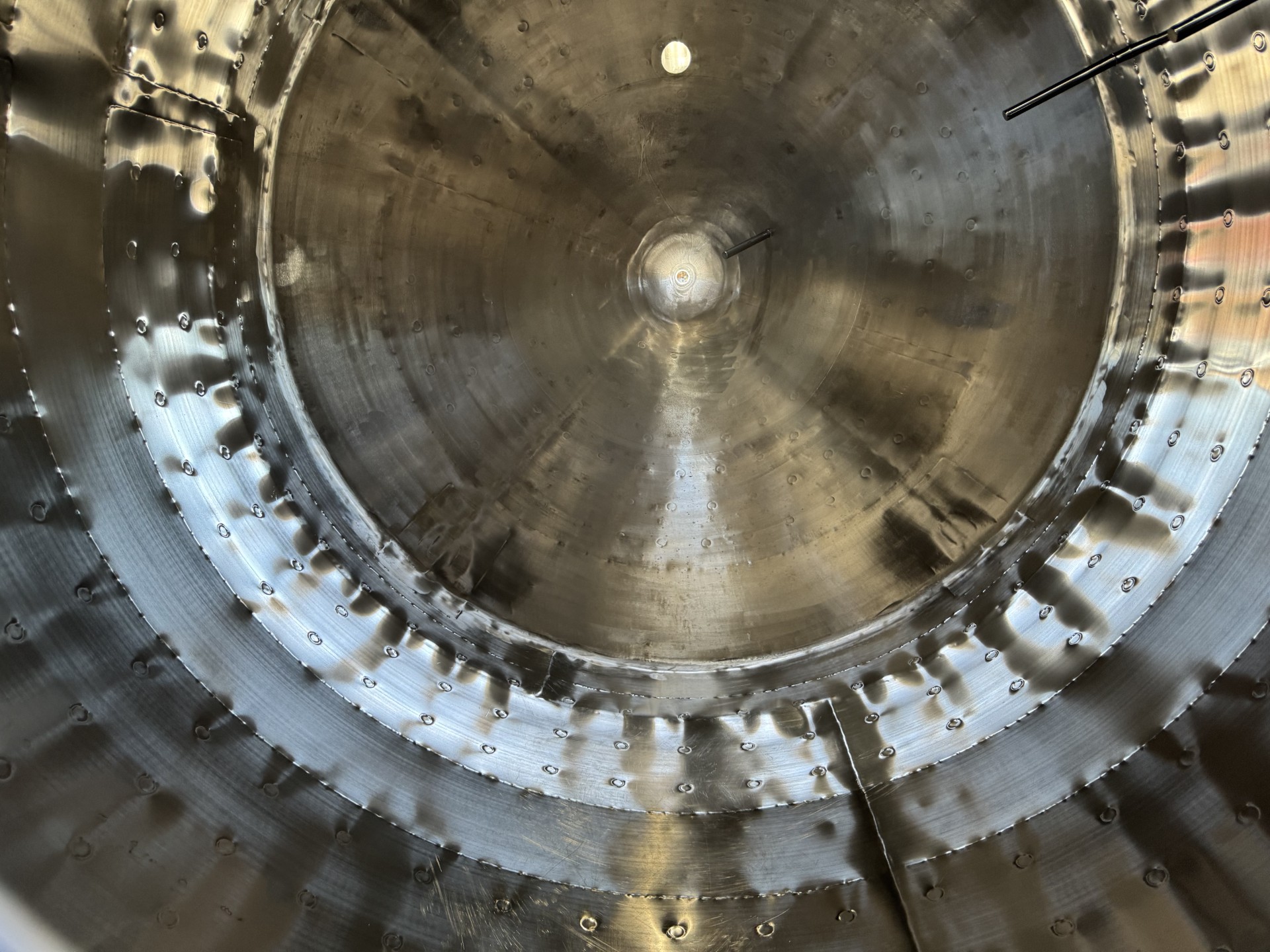2,000 GALLON FERMENTER TANK. VERTICAL, CYLINDRICAL/CONICAL, DOMED TOP , CONE BOTTOM , JACKET, 304 SS EXTERIOR, 2" TC OUTLET. MANHOLE, SPRAYBALL, THERMOWELL. HEIGHT 144", DIAMETER 90".